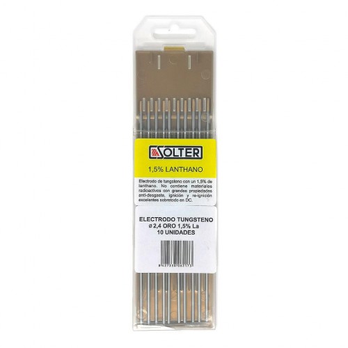 Electrodo de Tungsteno 1,5% Lantano, color oro Ø2,4mm. Para DC (corriente continua). Caja de 10 uds.